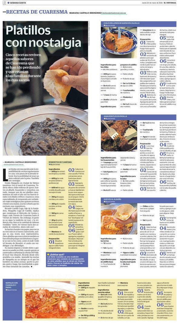 La cocina de Cuaresma sigue viva en las fondas. Cuando me pidieron una nota con recetas para el Especial de Semana Santa de El Universal (que se publicó el 26 de marzo de 2026 en la versión impresa de este diario), pensé de inmediato en esto y puse manos a la obra.
